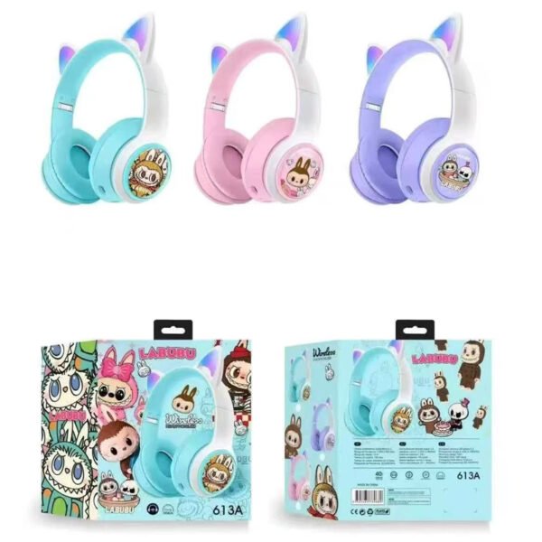 AURICULAR VINCHA BLUETOOTH 613 LABUBU CON LUZ Y OREJAS DE GATO
