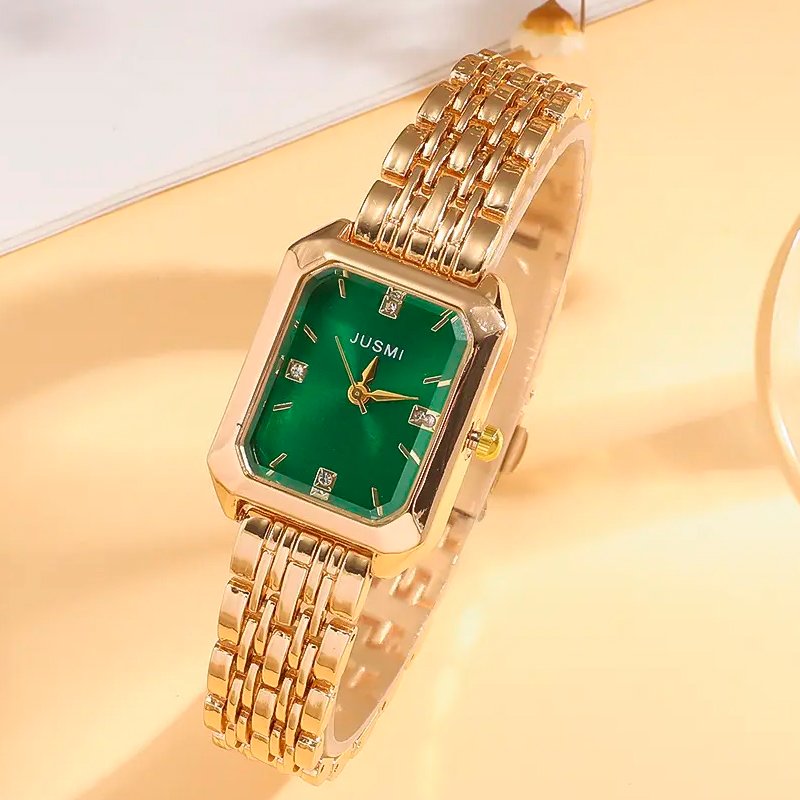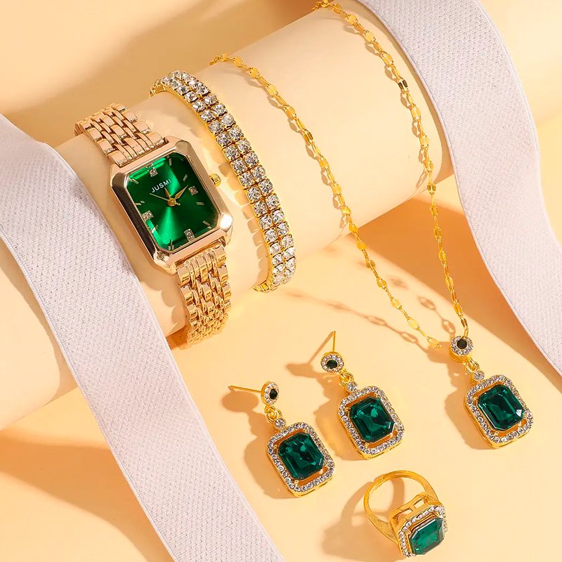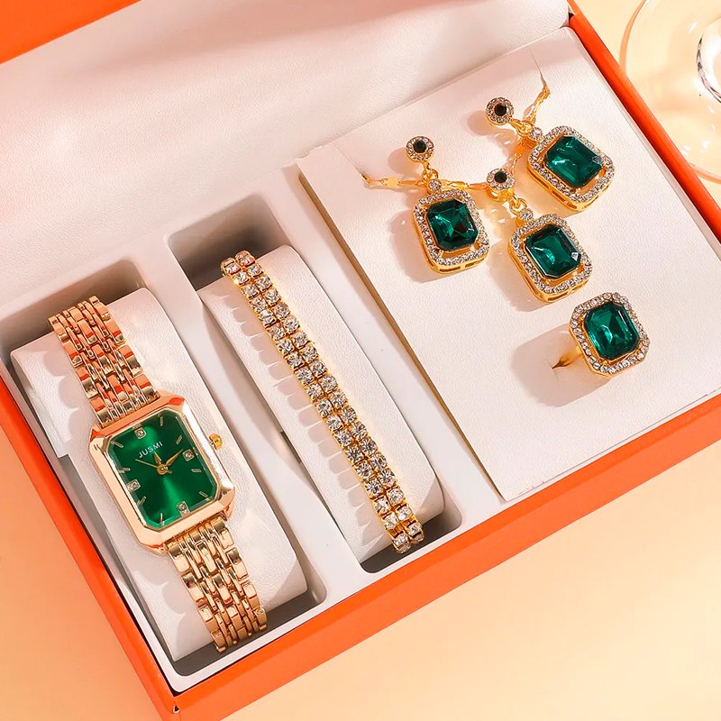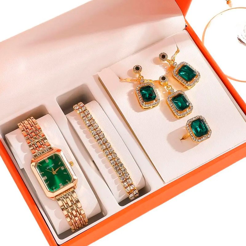 RELOJ PARA MUJER EN CAJA CON PULSERA ANILLO AROS VERDE ESMERALDA SH-006