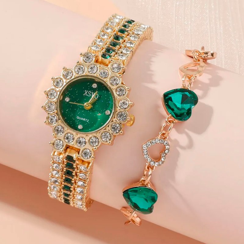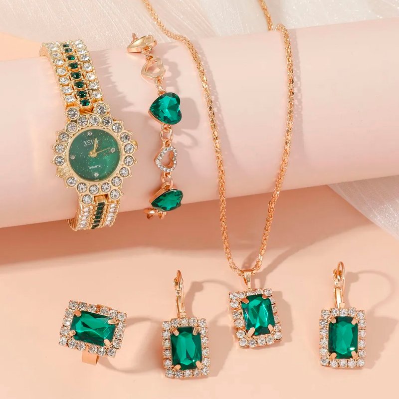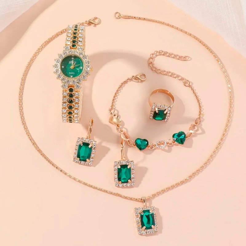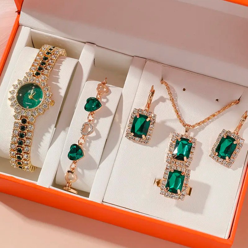 RELOJ PARA MUJER EN CAJA CON PULSERA ANILLO AROS VERDE ESMERALDA SH-007