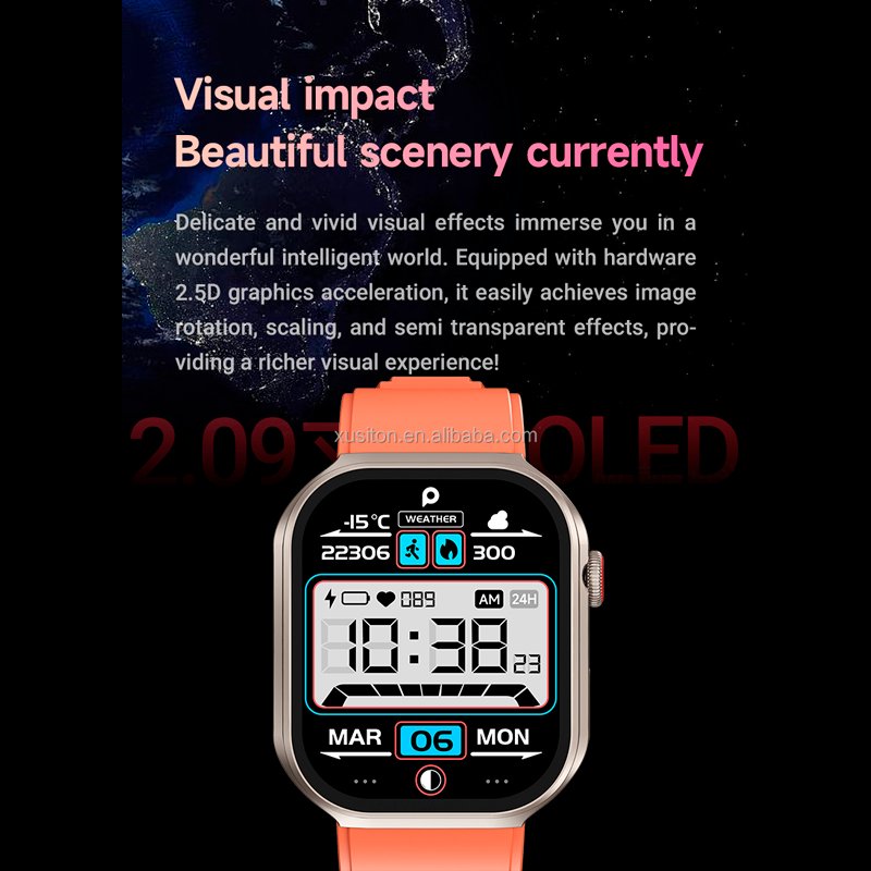 Calendario, Reloj despertador, Rastreador de sueño, seguimiento de forma, Recordatorio de llamada, Respuesta telefónica, Mensaje emergente, Recordatorio de mensajes, Marcar llamada, Notificaciones de Medios sociales, Reproductor DE MÚSICA. Pantalla táctil, Luz intermitente LED. 2.09 Pulgadas IPS/Smartwatch hombre